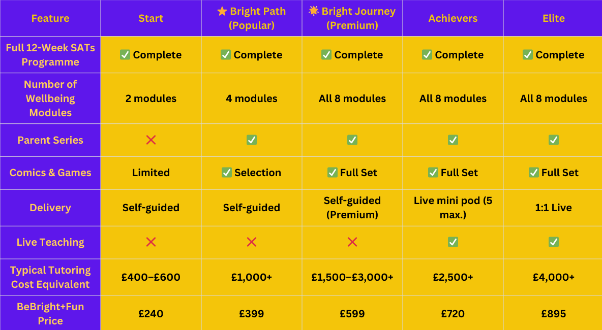 💡 Families typically spend £1,200–£1,700+ on private SATs tutoring over 12 weeks. Bright Journey delivers full academic preparation and wellbeing support for just £599.